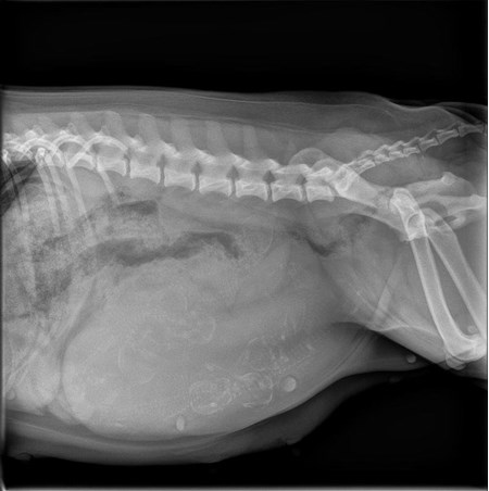 Deze RX-foto toont de ongeboren puppy's tijdens de zwangerschap.